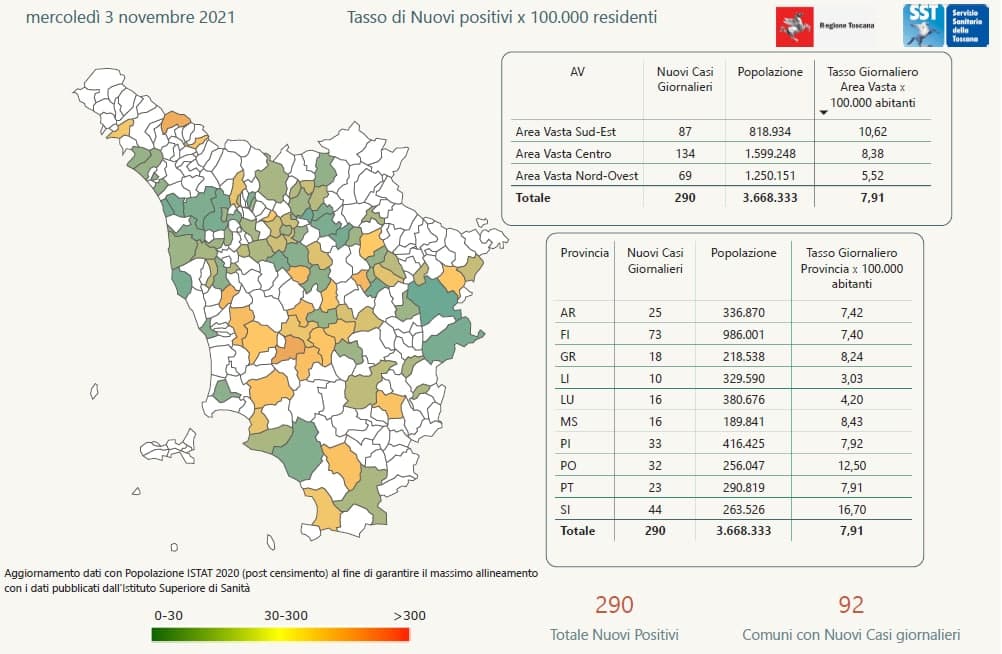 Pubblicati i dati di oggi 3 novembre in Regione Toscana. Sono 290 i nuovi casi positivi in Toscana nelle ultime 24 ore