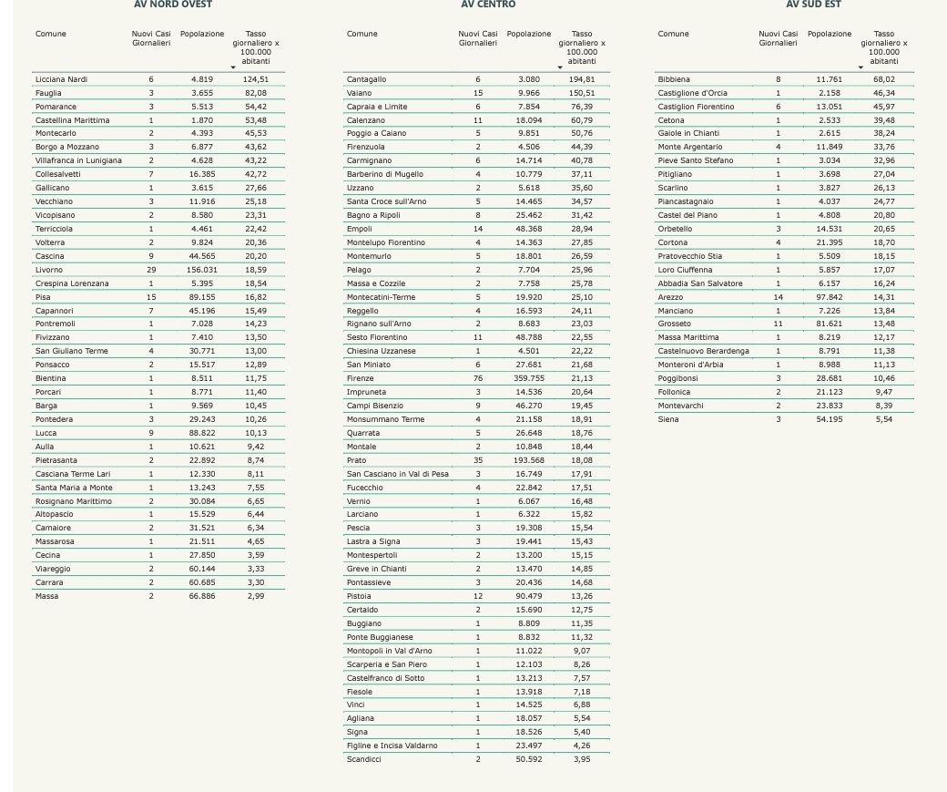 “I nuovi casi registrati in Toscana sono 521 su 38.527 test di cui 9.477 tamponi molecolari e 29.050 test rapidi. Il tasso dei nuovi positivi è 1,35% (5,9% sulle prime diagnosi).