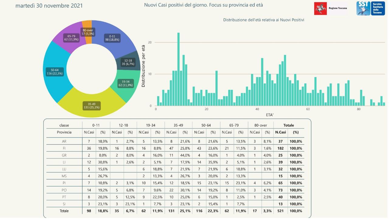 Pubblicati i dati di oggi, 30 novembre, in Regione Toscana. Sono 521 i nuovi casi positivi in Toscana nelle ultime 24 ore