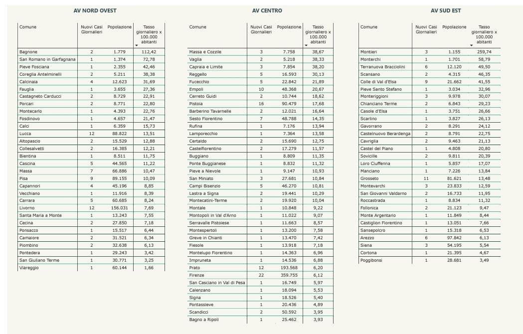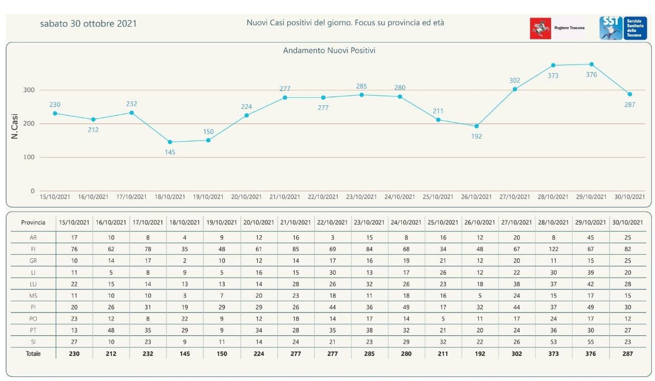 “I nuovi casi registrati in Toscana sono 287 su 29.854 test di cui 8.202 tamponi molecolari e 21.652 test rapidi. Il tasso dei nuovi positivi è 0,96% (3,2% sulle prime diagnosi).