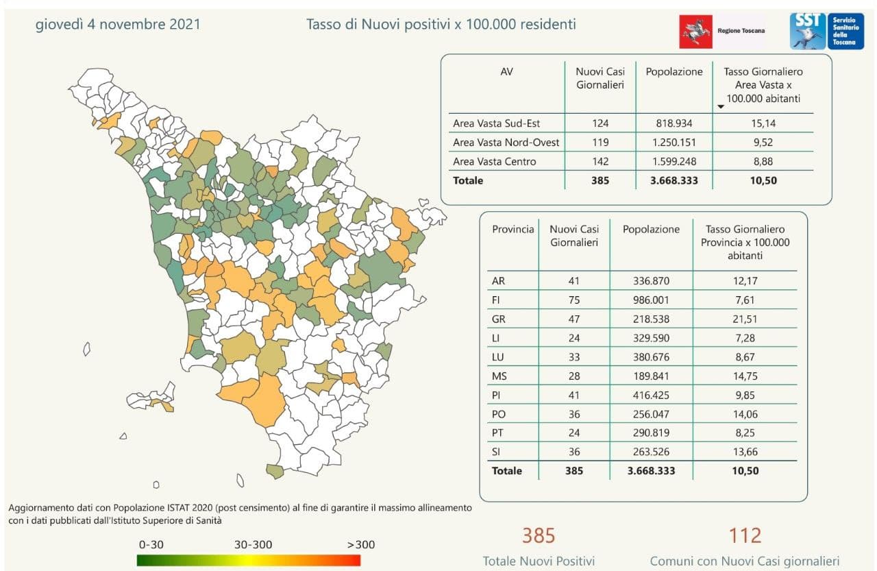 Pubblicati i dati di oggi 4 novembre in Regione Toscana. Sono 385 i nuovi casi positivi in Toscana nelle ultime 24 ore