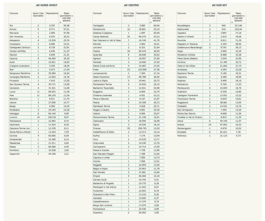 “I nuovi casi registrati in Toscana sono 491 su 19.442 test di cui 8.243 tamponi molecolari e 11.199 test rapidi. Il tasso dei nuovi positivi è 2,53% (8,8% sulle prime diagnosi).