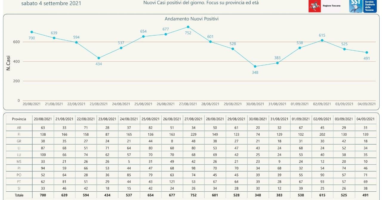 Anticipati i dati di oggi 4 settembre in Regione Toscana dal governatore Giani. Sono 491 i nuovi casi positivi in Toscana nelle ultime 24 ore