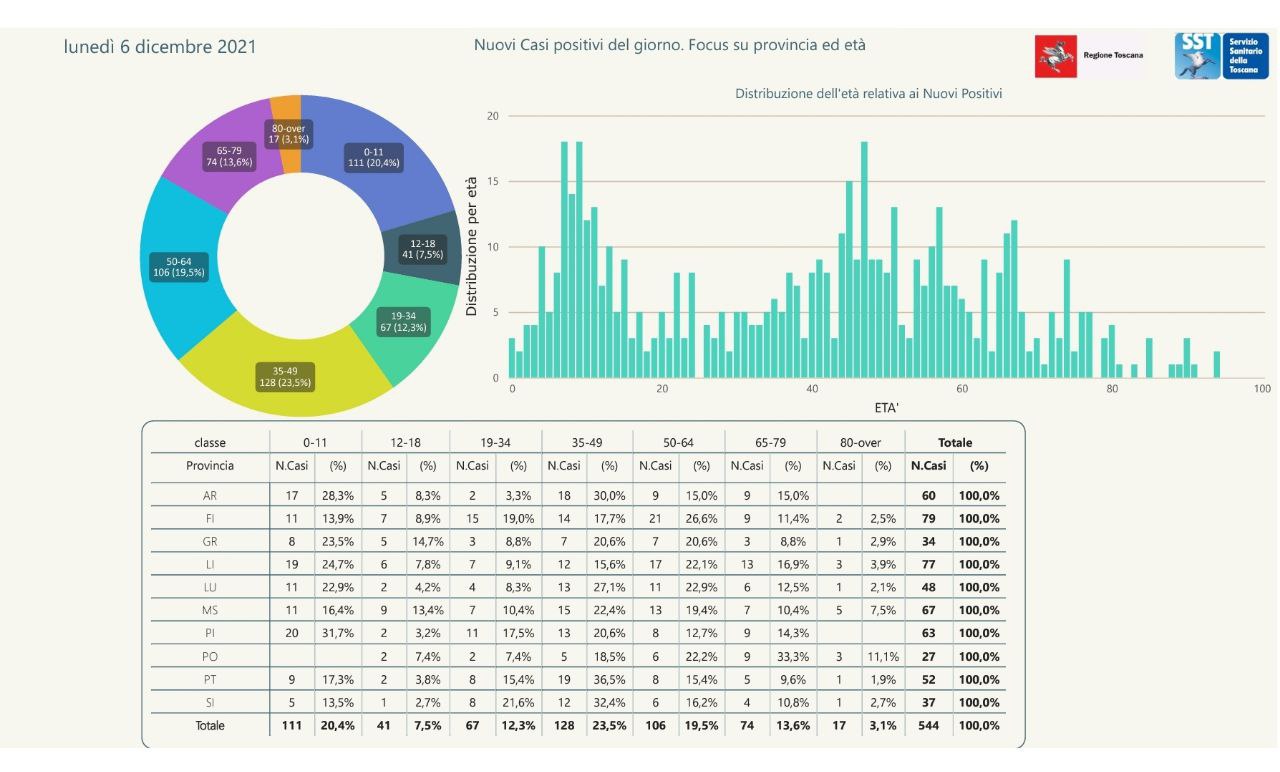 Pubblicati i dati di oggi, 6 dicembre, in Regione Toscana. Sono 544 i nuovi casi positivi in Toscana nelle ultime 24 ore