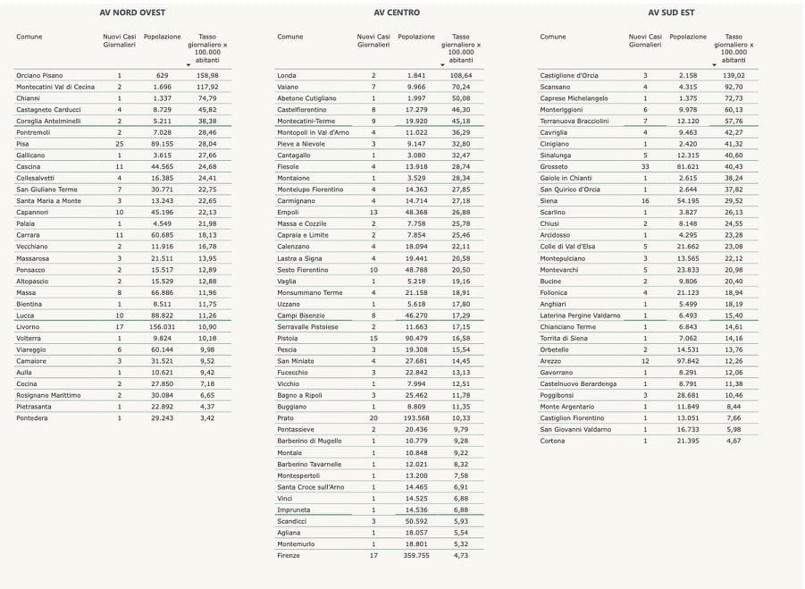 “I nuovi casi registrati in Toscana sono 459 su 28.511 test di cui 8.935 tamponi molecolari e 19.576 test rapidi. Il tasso dei nuovi positivi è 1,61% (5,2% sulle prime diagnosi).