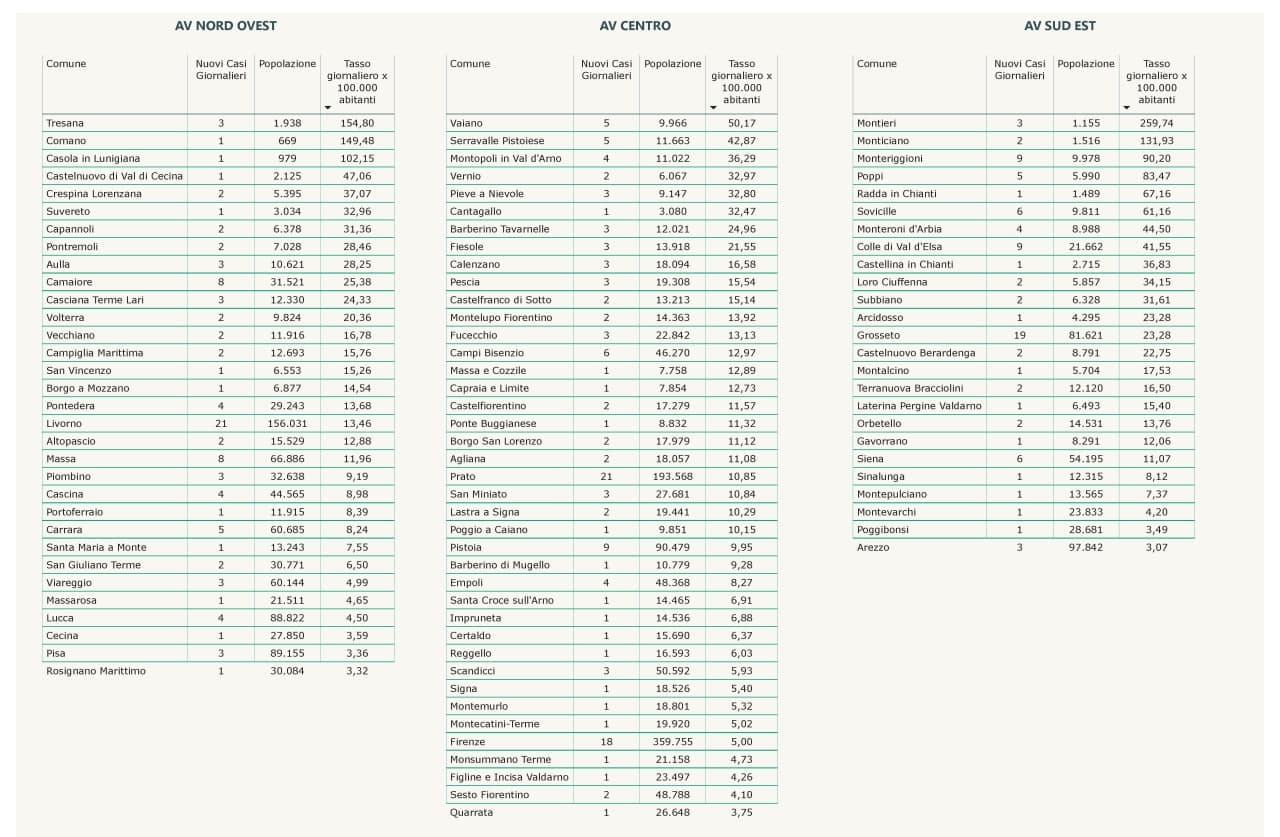 “I nuovi casi registrati in Toscana sono 313 su 7.006 test di cui 5.212 tamponi molecolari e 1.794 test rapidi. Il tasso dei nuovi positivi è 4,47% (11,9% sulle prime diagnosi).