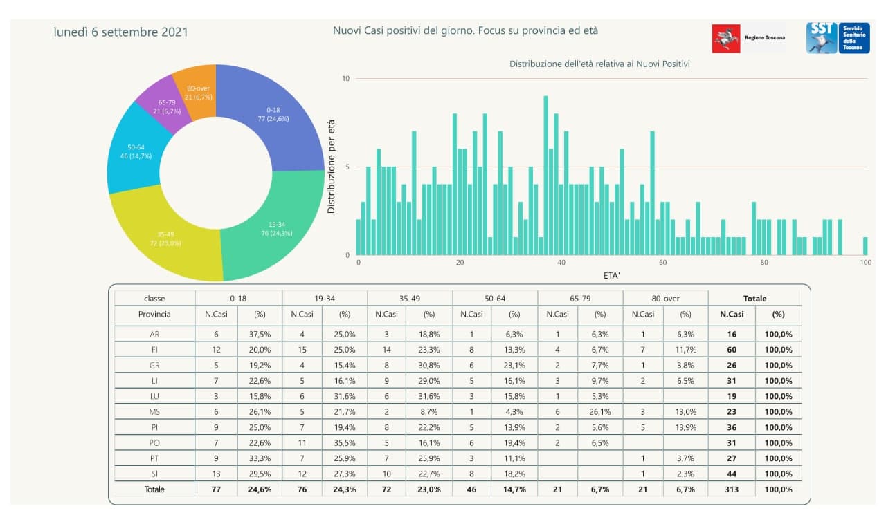 Anticipati i dati di oggi 6 settembre in Regione Toscana dal governatore Giani. Sono 313 i nuovi casi positivi in Toscana nelle ultime 24 ore