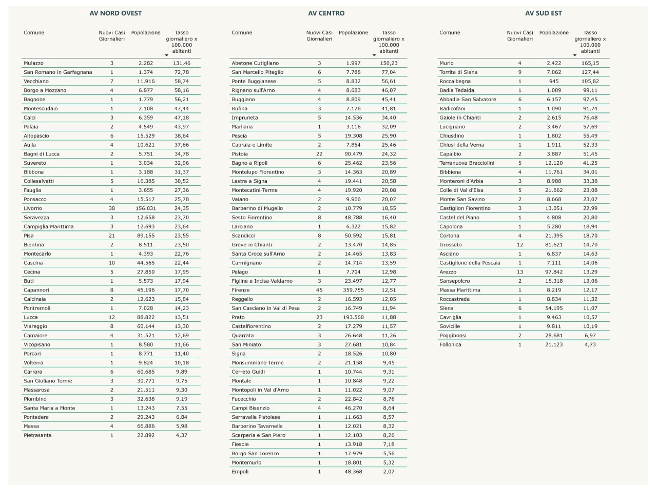 “I nuovi casi registrati in Toscana sono 498 su 38.874 test di cui 8.603 tamponi molecolari e 30.271 test rapidi. Il tasso dei nuovi positivi è 1,28% (5,9% sulle prime diagnosi).