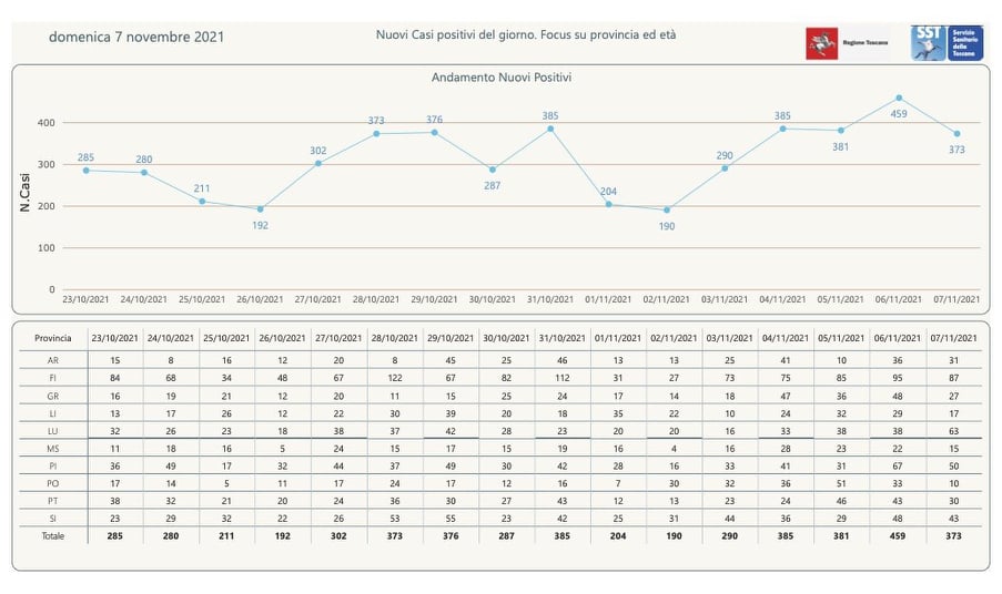 Pubblicati i dati di oggi, 7 novembre, in Regione Toscana. Sono 373 i nuovi casi positivi in Toscana nelle ultime 24 ore