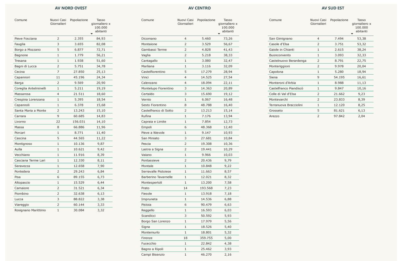 “I nuovi casi registrati in Toscana sono 263 su 12.689 test di cui 5.757 tamponi molecolari e 6.932 test rapidi. Il tasso dei nuovi positivi è 2,07% (6,2% sulle prime diagnosi).