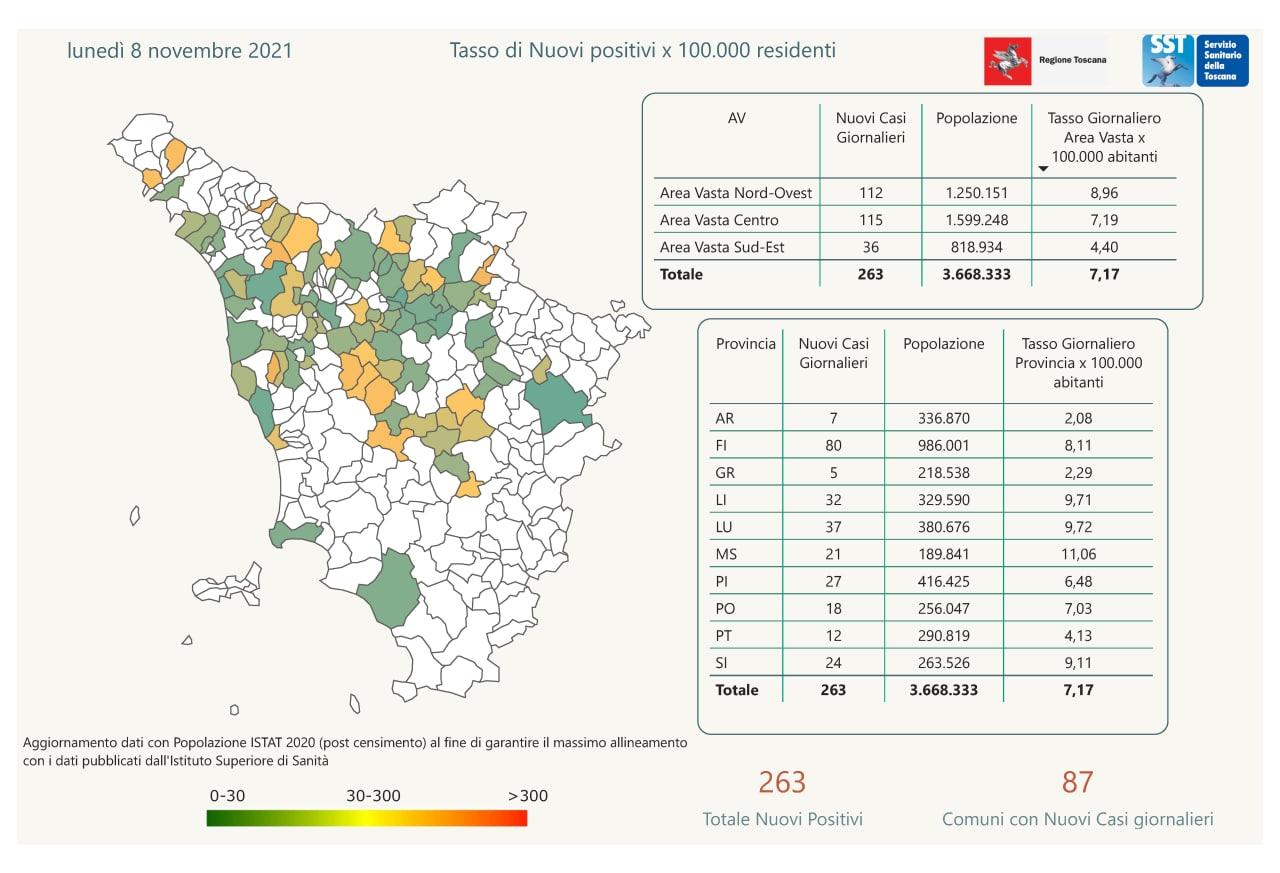 Pubblicati i dati di oggi, 8 novembre, in Regione Toscana. Sono 263 i nuovi casi positivi in Toscana nelle ultime 24 ore