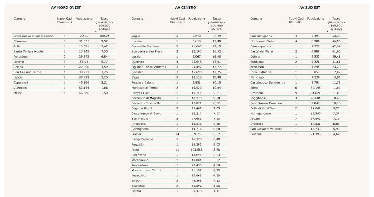 “I nuovi casi registrati in Toscana sono 159 su 16.200 test di cui 7.357 tamponi molecolari e 8.853 test rapidi. Il tasso dei nuovi positivi è 0,98% (3,1% sulle prime diagnosi).