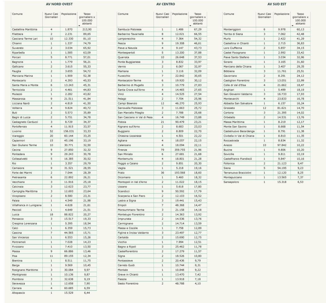 Covid: i dati di oggi in Toscana con la progressione degli ultimi 15 giorni