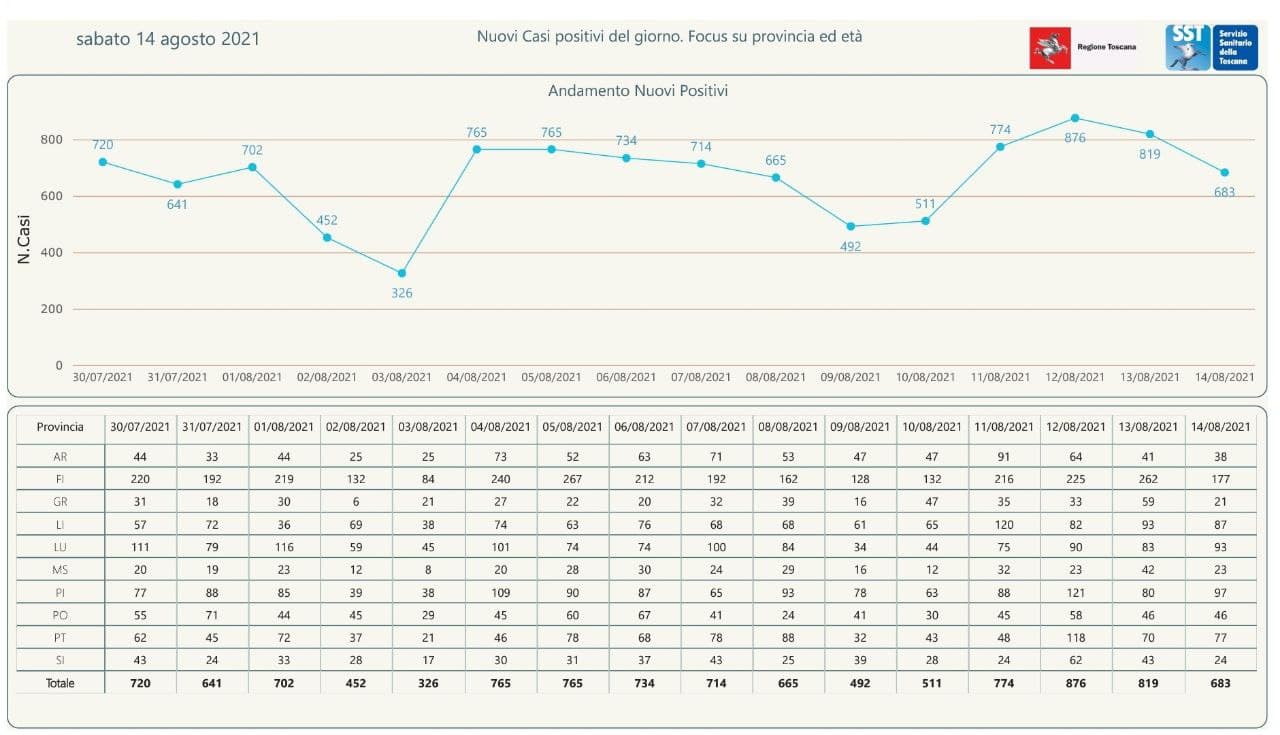 Il governatore Giani ha anticipato i primi dati di oggi 14 agosto. Sono 683 i nuovi casi positivi in Toscana nelle ultime 24 ore