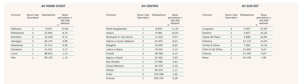 “I nuovi casi registrati in Toscana sono 41 su 9.059 test di cui 5.790 tamponi molecolari e 3.269 test rapidi. Il tasso dei nuovi positivi è 0,45% (0,9% sulle prime diagnosi).