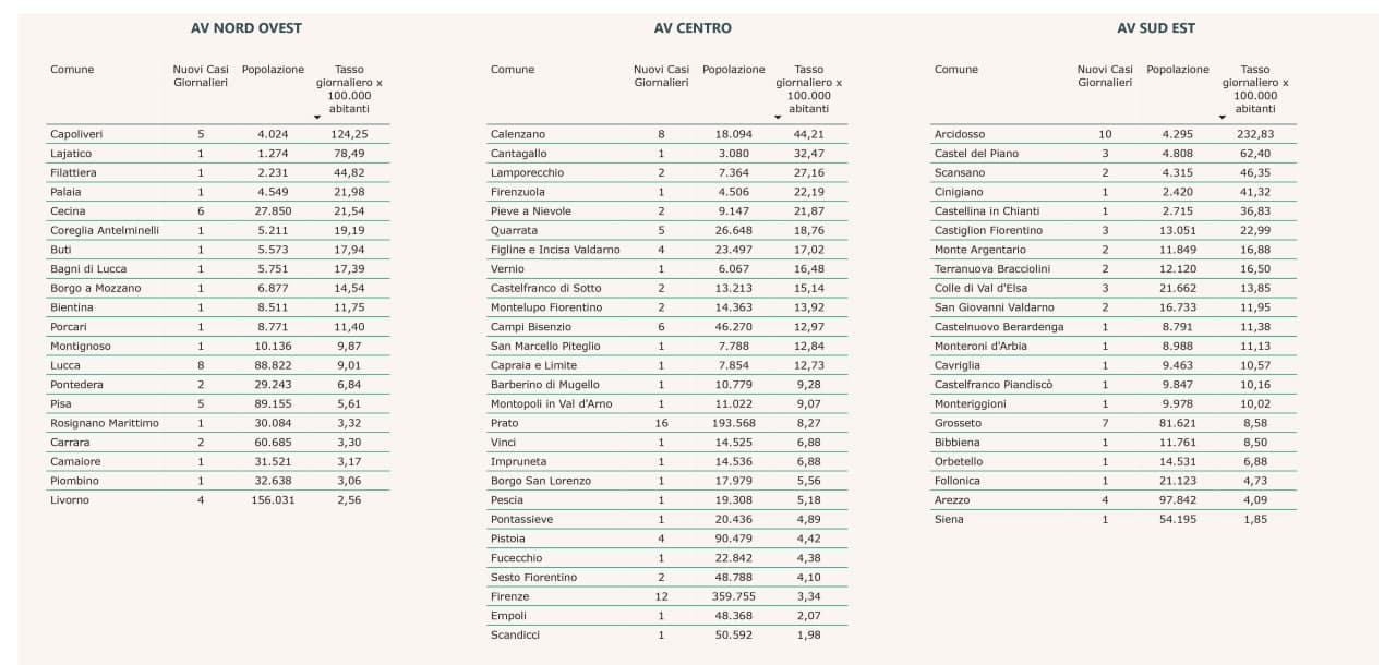 “I nuovi casi registrati in Toscana sono 174 su 16.101 test di cui 8.184 tamponi molecolari e 7.917 test rapidi. Il tasso dei nuovi positivi è 1,08% (2,8% sulle prime diagnosi).