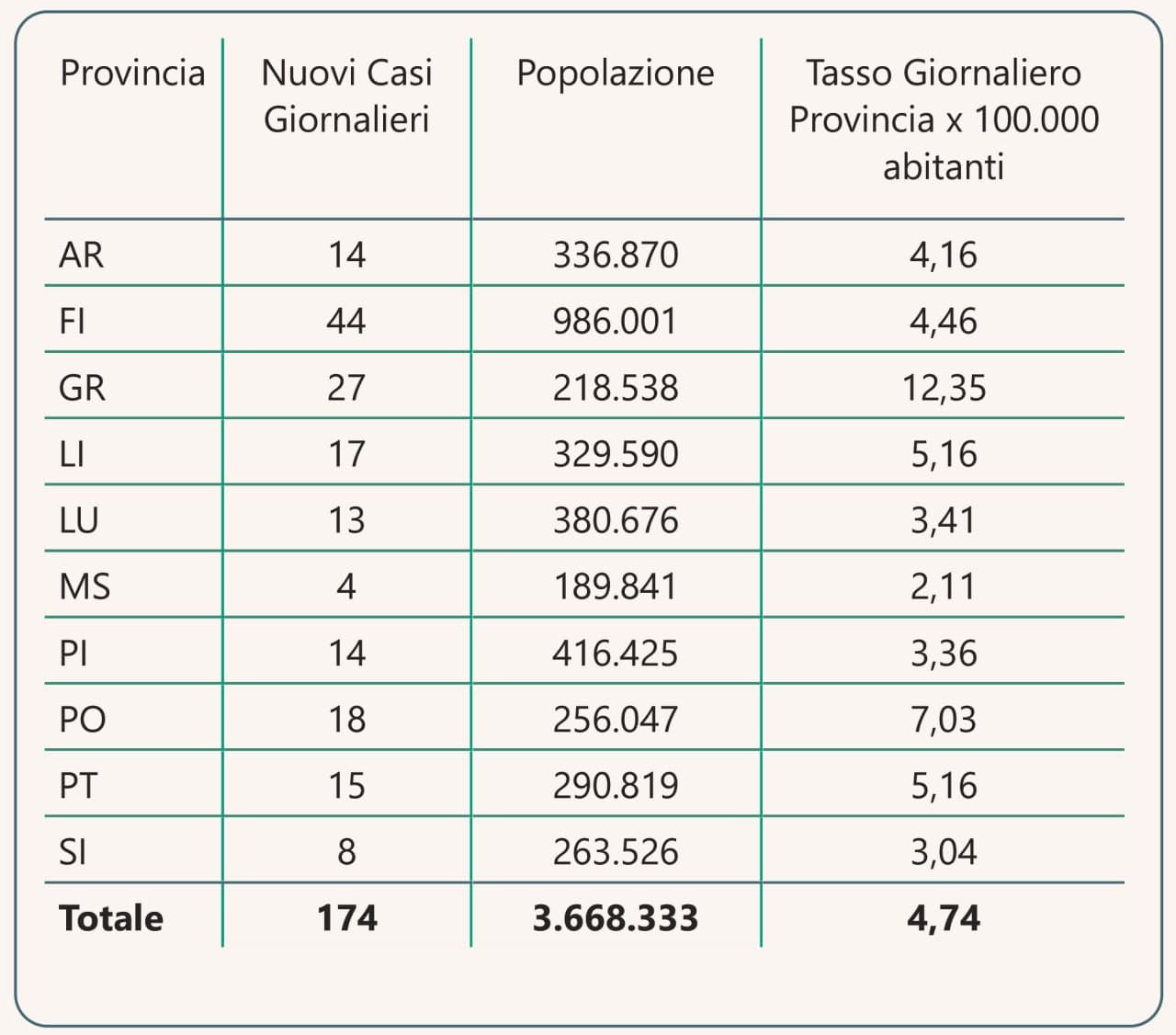 Il governatore Giani ha anticipato i primi dati di oggi 10 giugno. Sono 174 i nuovi casi positivi in Toscana nelle ultime 24 ore