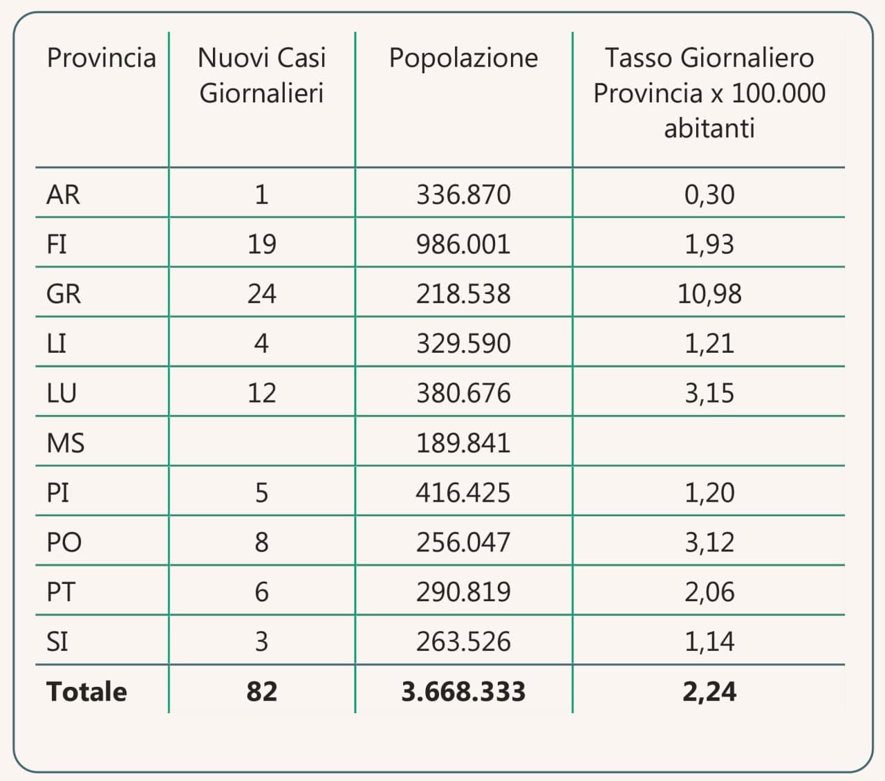 “I nuovi casi registrati in Toscana sono 82 su 5.068 test di cui 4.054 tamponi molecolari e 1.014 test rapidi. Il tasso dei nuovi positivi è 1,62% (4,1% sulle prime diagnosi).