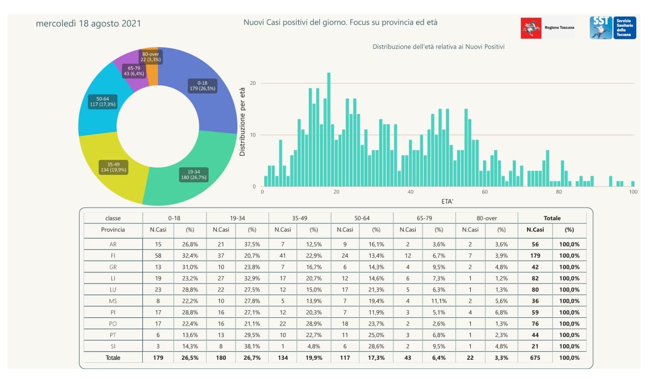 Anticipati i dati di oggi 18 agosto in Regione Toscana dal governatore Giani. Sono 675 i nuovi casi positivi in Toscana nelle ultime 24 ore