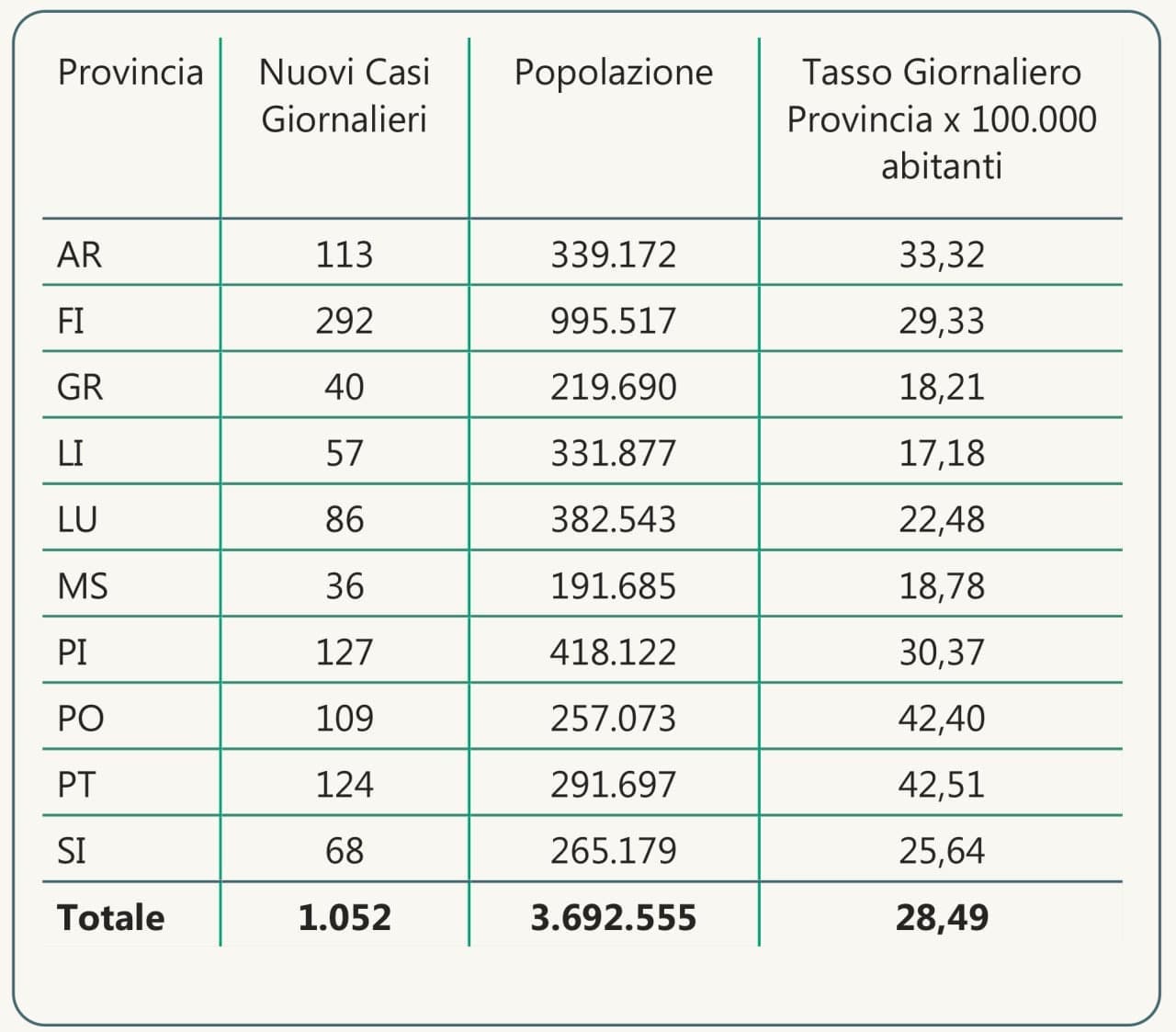 “I nuovi casi registrati in Toscana sono 1.052 su 27.189 test di cui 14.194 tamponi molecolari e 12.995 test rapidi. Il tasso dei nuovi positivi è 3,87% (9,9% sulle prime diagnosi).”