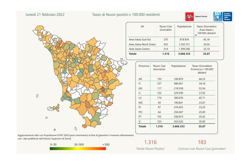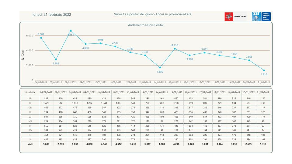“I nuovi casi registrati in Toscana sono 1.316 su 11.630 test di cui 5.157 tamponi molecolari e 6.473 test rapidi. Il tasso dei nuovi positivi è 11,32% (47,3% sulle prime diagnosi).