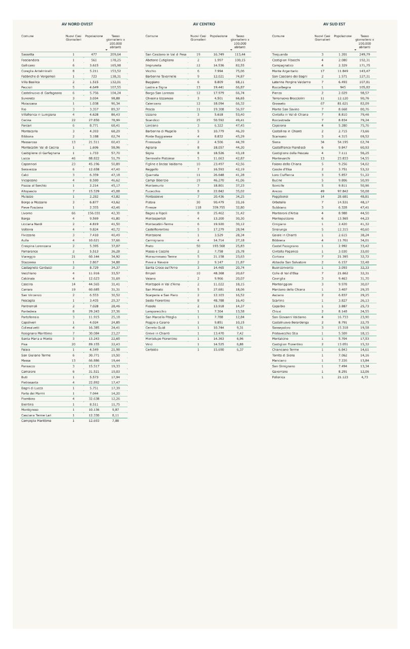I dati suddivisi per comune: