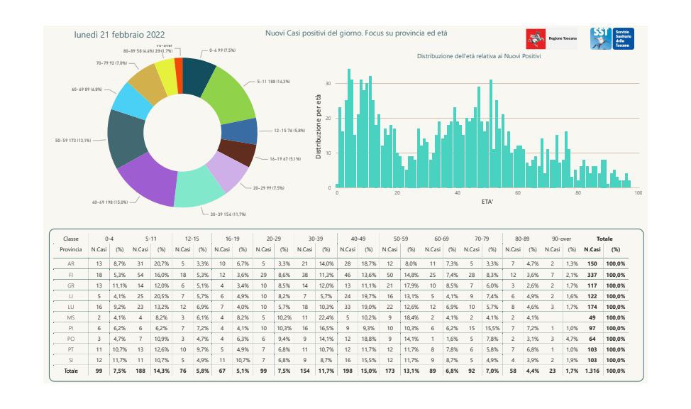 “I nuovi casi registrati in Toscana sono 1.316 su 11.630 test di cui 5.157 tamponi molecolari e 6.473 test rapidi. Il tasso dei nuovi positivi è 11,32% (47,3% sulle prime diagnosi).
