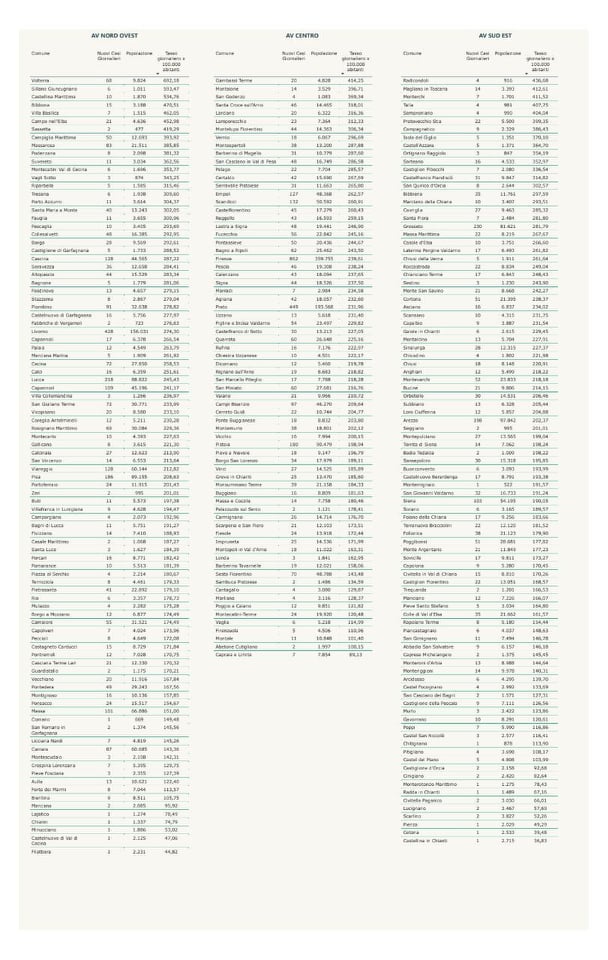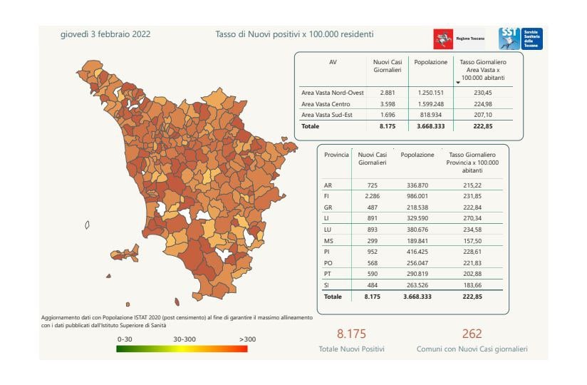 “I nuovi casi registrati in Toscana sono 8.175 su 61.762 test di cui 17.546 tamponi molecolari e 44.216 test rapidi. Il tasso dei nuovi positivi è 13,24% (67,3% sulle prime diagnosi).