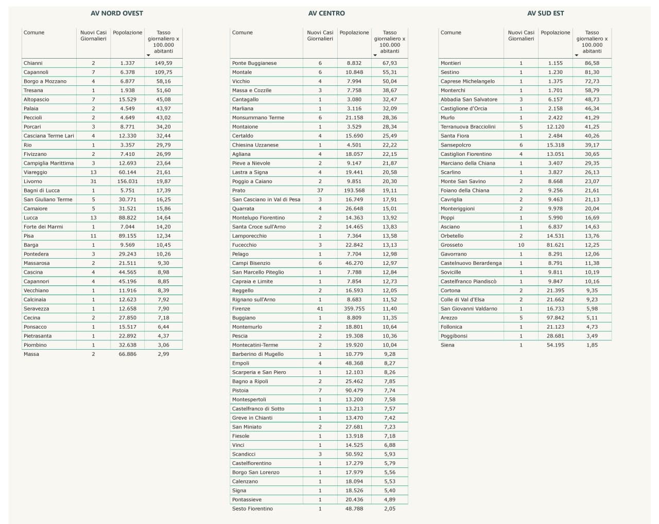 “I nuovi casi registrati in Toscana sono 396 su 11.226 test di cui 6.312 tamponi molecolari e 4.914 test rapidi. Il tasso dei nuovi positivi è 3,53% (9,0% sulle prime diagnosi).