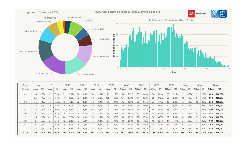 “I nuovi casi registrati in Toscana sono 4.134 su 29.480 test di cui 7.401 tamponi molecolari e 22.079 test rapidi. Il tasso dei nuovi positivi è 14,02% (57,6% sulle prime diagnosi).