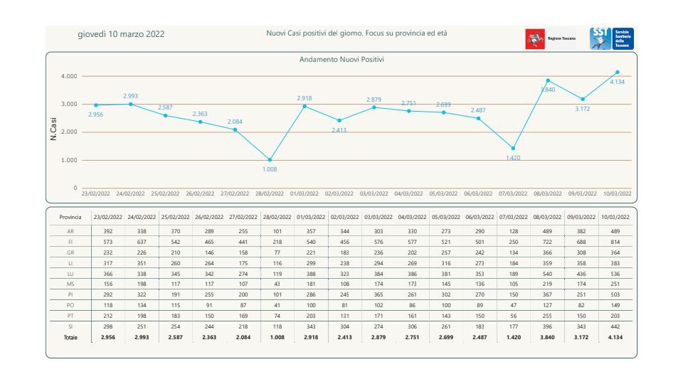 Pubblicati i dati di oggi dal Governatore. Giani. In Toscana sono 4.134 nuovi positivi al covid-19. Nel pisano sono 503 i nuovi casi