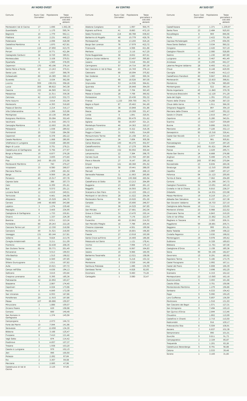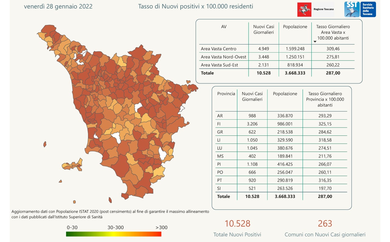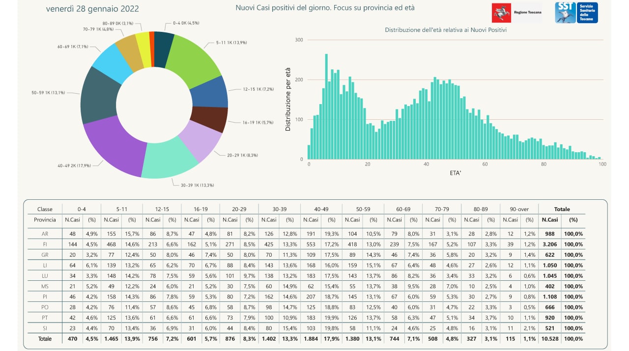 “I nuovi casi registrati in Toscana sono 10.528 su 68.127 test di cui 19.510 tamponi molecolari e 48.617 test rapidi. Il tasso dei nuovi positivi è 15,45% (73,2% sulle prime diagnosi).