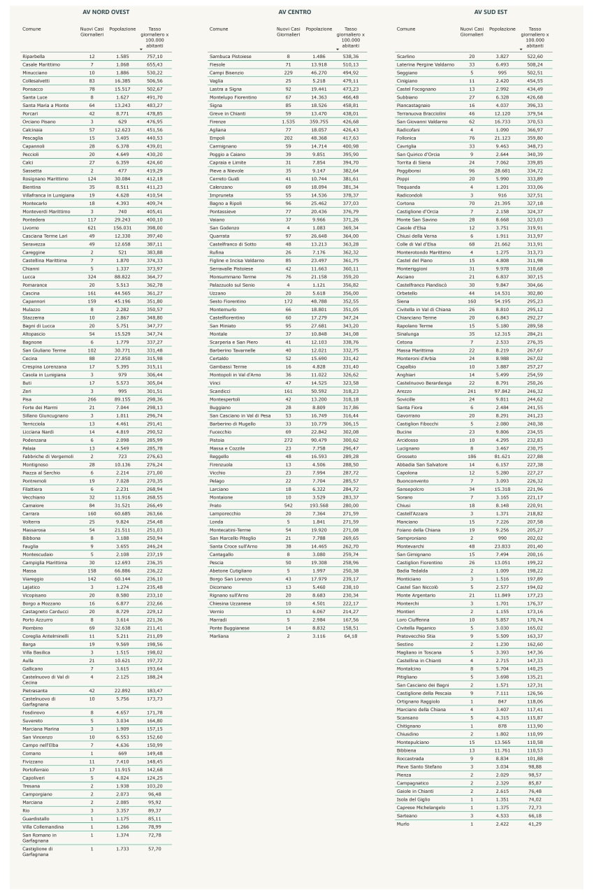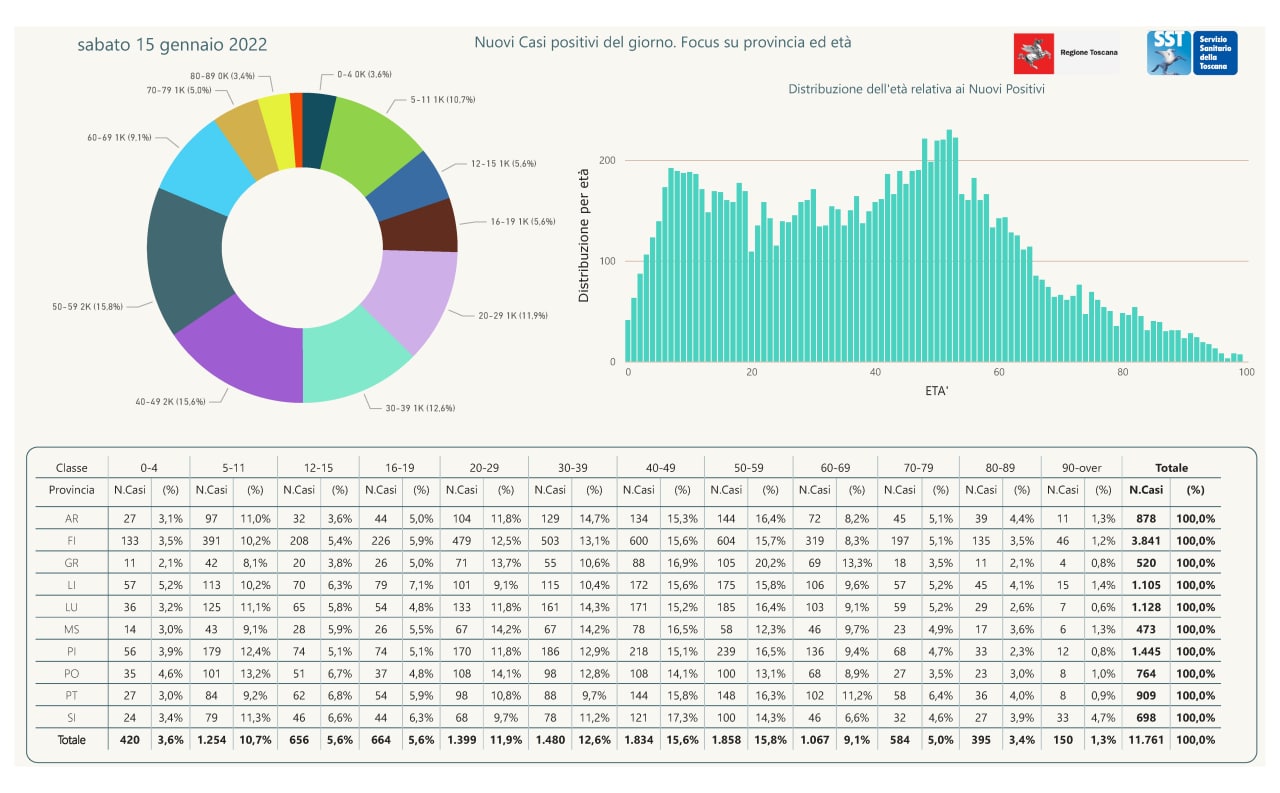 “I nuovi casi registrati in Toscana sono 11.761 su 75.958 test di cui 22.324 tamponi molecolari e 53.634 test rapidi. Il tasso dei nuovi positivi è 15,48% (67,8% sulle prime diagnosi).