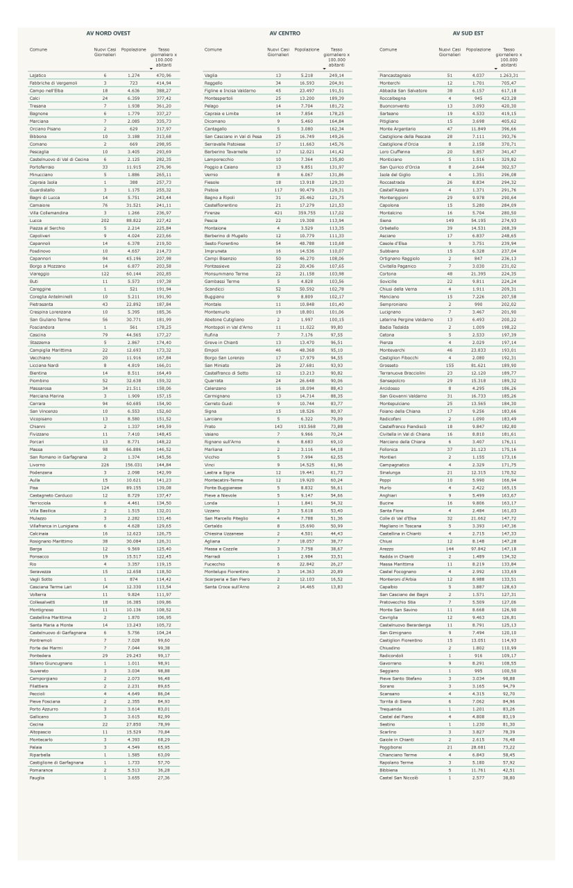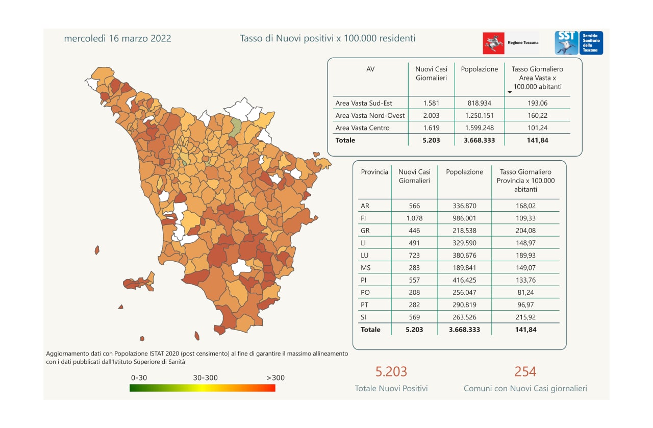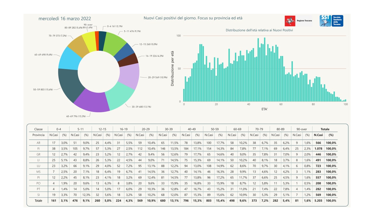 “I nuovi casi registrati in Toscana sono 5.203 su 30.993 test di cui 7.861 tamponi molecolari e 23.132 test rapidi. Il tasso dei nuovi positivi è 16,79% (59,4% sulle prime diagnosi).