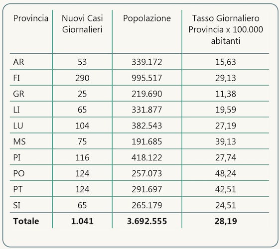 “I nuovi casi registrati in Toscana sono 1.041 su 24.439 test di cui 13.896 tamponi molecolari e 10.543 test rapidi. Il tasso dei nuovi positivi è 4,26% (11,9% sulle prime diagnosi).”