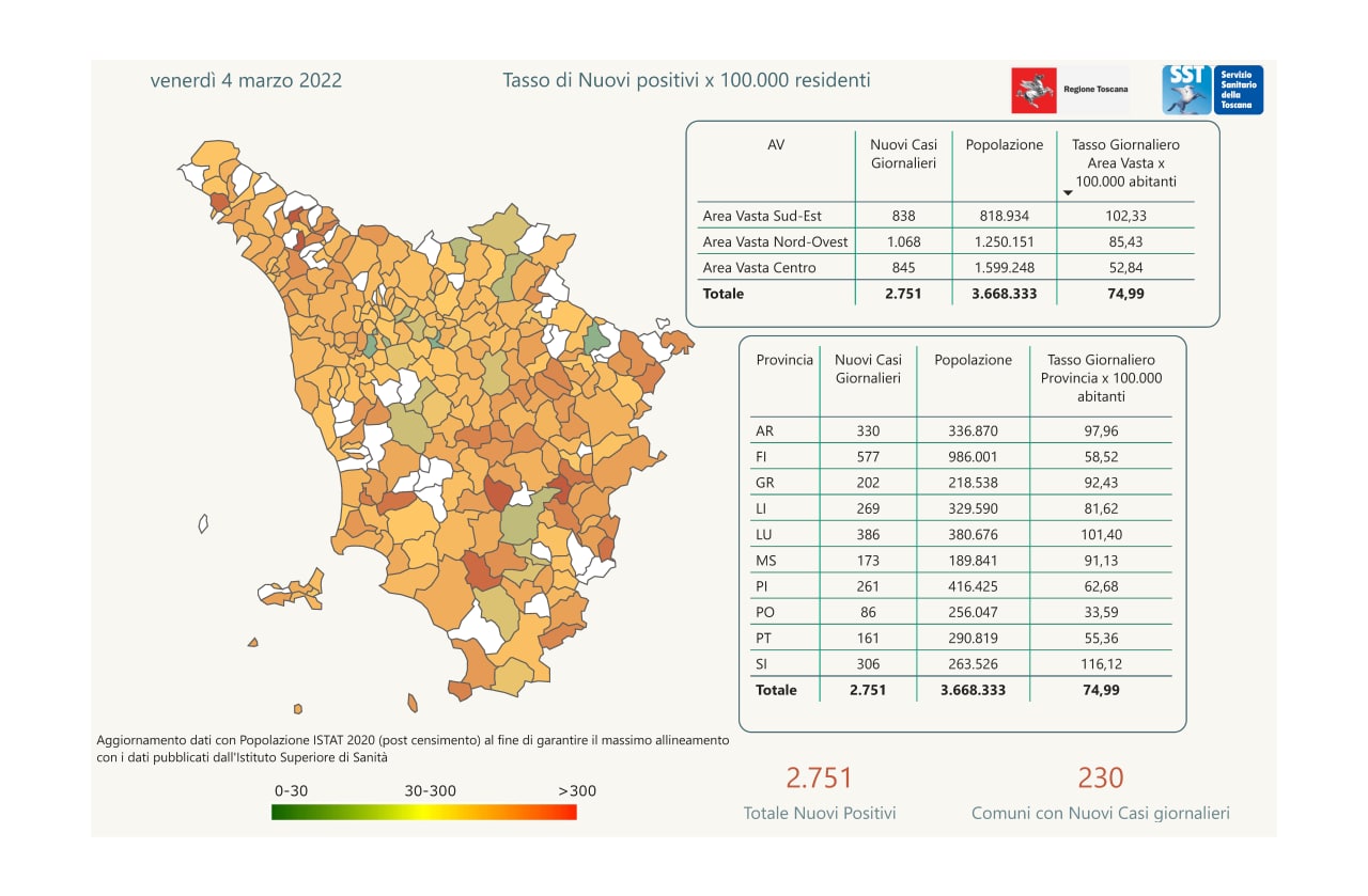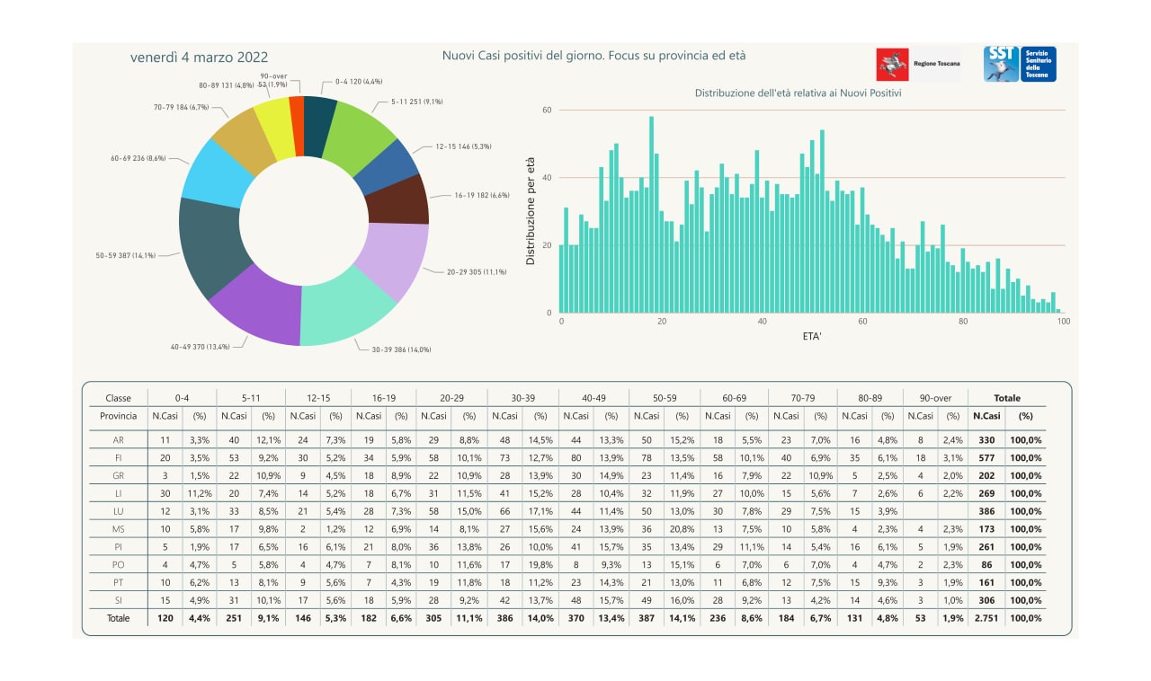 Pubblicati i dati di oggi dal Governatore. Giani. In Toscana sono 2.751 nuovi positivi al covid-19. Nel pisano sono 261 i nuovi casi