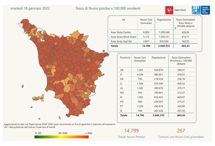“I nuovi casi registrati in Toscana sono 14.799 su 93.572 test di cui 20.014 tamponi molecolari e 73.558 test rapidi. Il tasso dei nuovi positivi è 15,82% (76,0% sulle prime diagnosi).