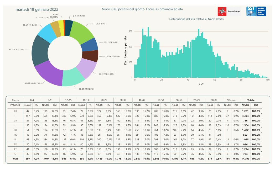 “I nuovi casi registrati in Toscana sono 14.799 su 93.572 test di cui 20.014 tamponi molecolari e 73.558 test rapidi. Il tasso dei nuovi positivi è 15,82% (76,0% sulle prime diagnosi).