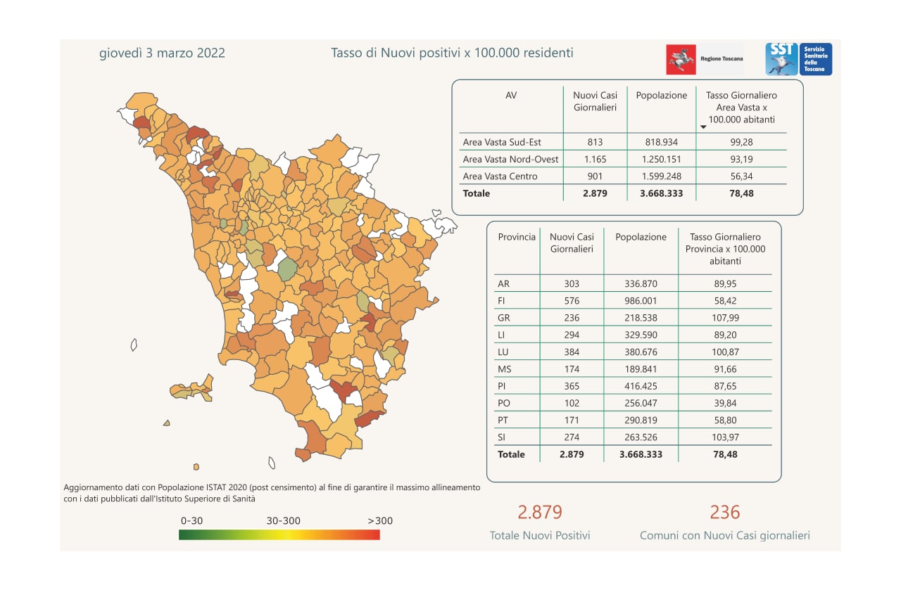 “I nuovi casi registrati in Toscana sono 2.879 su 27.195 test di cui 7.571 tamponi molecolari e 19.624 test rapidi. Il tasso dei nuovi positivi è 10,59% (49,3% sulle prime diagnosi).