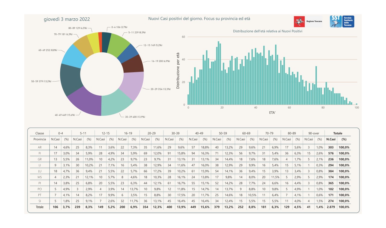 “I nuovi casi registrati in Toscana sono 2.879 su 27.195 test di cui 7.571 tamponi molecolari e 19.624 test rapidi. Il tasso dei nuovi positivi è 10,59% (49,3% sulle prime diagnosi).
