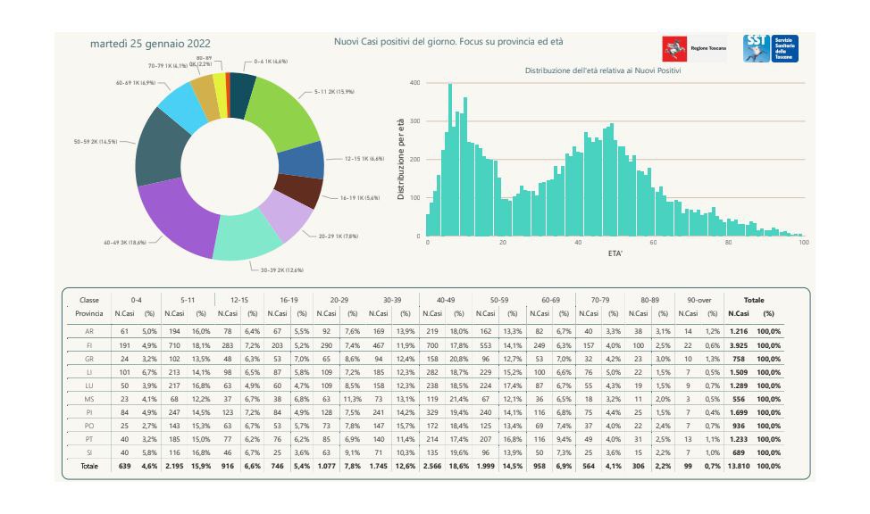 “I nuovi casi registrati in Toscana sono 13.810 su 94.629 test di cui 17.815 tamponi molecolari e 76.814 test rapidi. Il tasso dei nuovi positivi è 14,59% (77,3% sulle prime diagnosi).