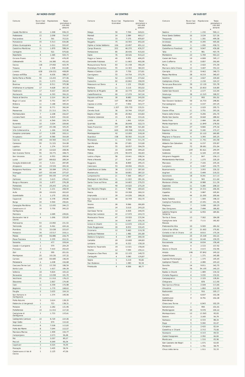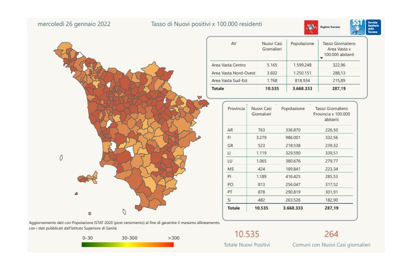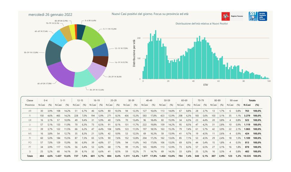 “I nuovi casi registrati in Toscana sono 10.535 su 65.769 test di cui 16.499 tamponi molecolari e 49.270 test rapidi. Il tasso dei nuovi positivi è 16,02% (73,8% sulle prime diagnosi).