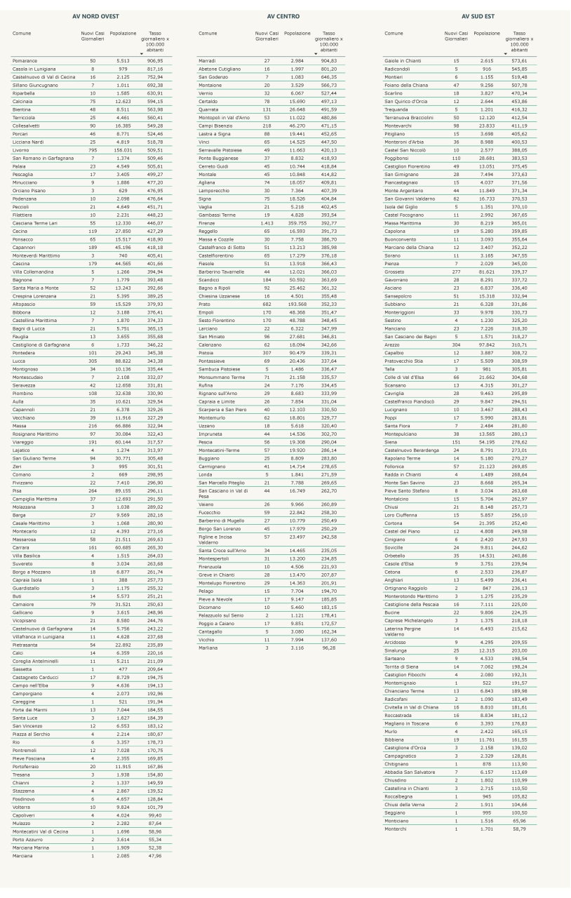“I nuovi casi registrati in Toscana sono 12.564 su 73.504 test di cui 20.917 tamponi molecolari e 52.587 test rapidi. Il tasso dei nuovi positivi è 17,09% (73,9% sulle prime diagnosi).