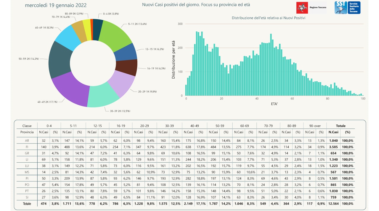 “I nuovi casi registrati in Toscana sono 12.564 su 73.504 test di cui 20.917 tamponi molecolari e 52.587 test rapidi. Il tasso dei nuovi positivi è 17,09% (73,9% sulle prime diagnosi).