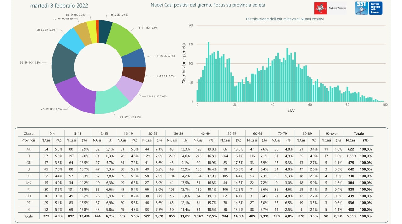 “I nuovi casi registrati in Toscana sono 6.653 su 65.157 test di cui 12.874 tamponi molecolari e 52.283 test rapidi. Il tasso dei nuovi positivi è 10,21% (67,2% sulle prime diagnosi).