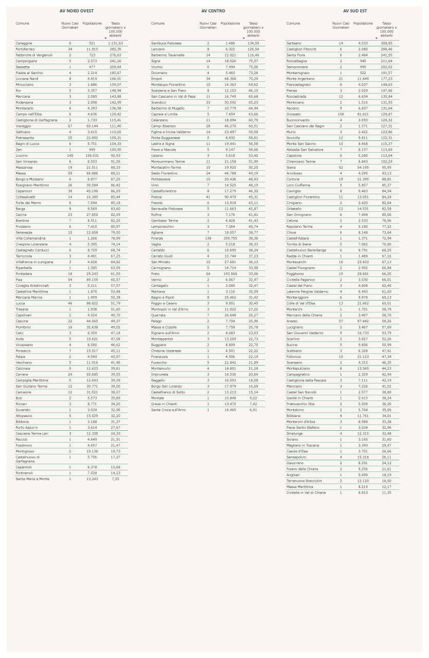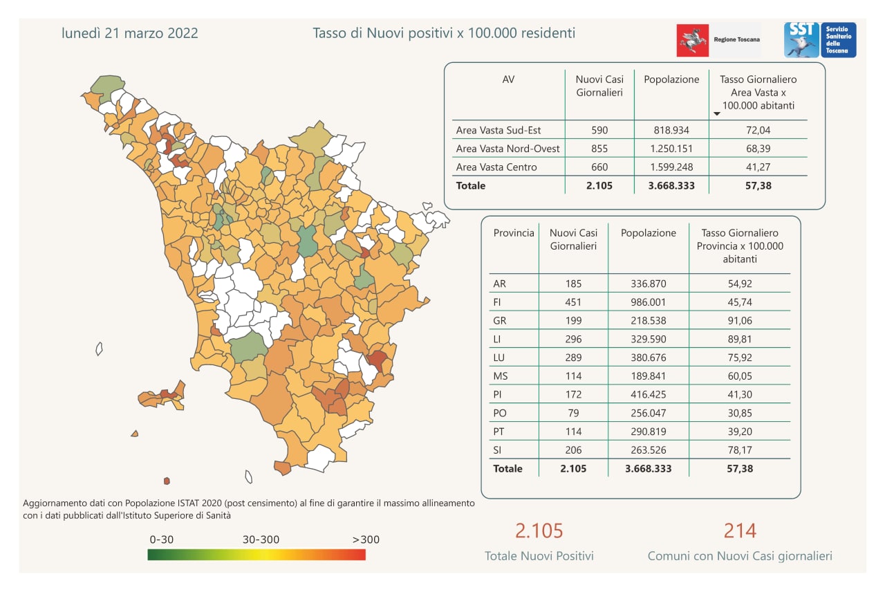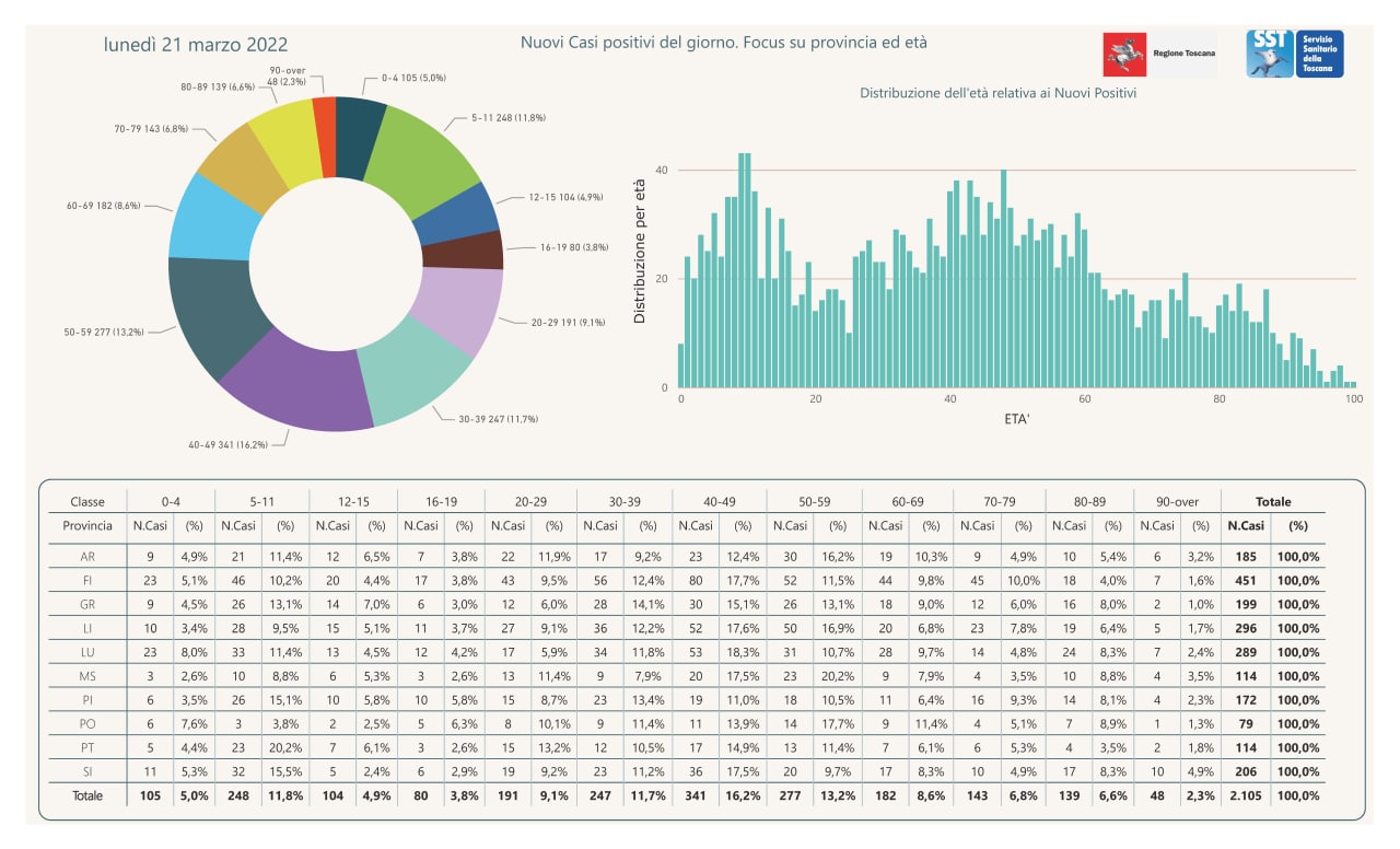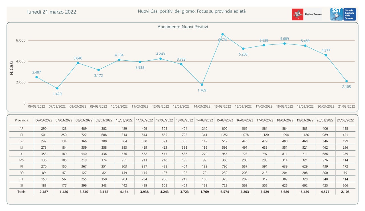 “I nuovi casi registrati in Toscana sono 2.105 su 11.889 test di cui 5.199 tamponi molecolari e 6.690 test rapidi. Il tasso dei nuovi positivi è 17,71% (51,9% sulle prime diagnosi).