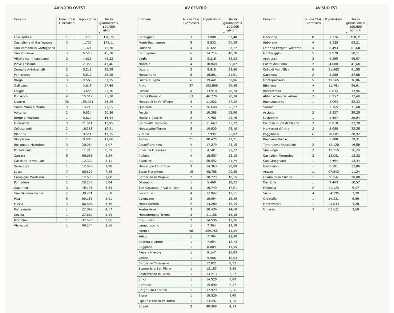“I nuovi casi registrati in Toscana sono 494 su 18.241 test di cui 8.705 tamponi molecolari e 9.536 test rapidi. Il tasso dei nuovi positivi è 2,71% (7,7% sulle prime diagnosi).