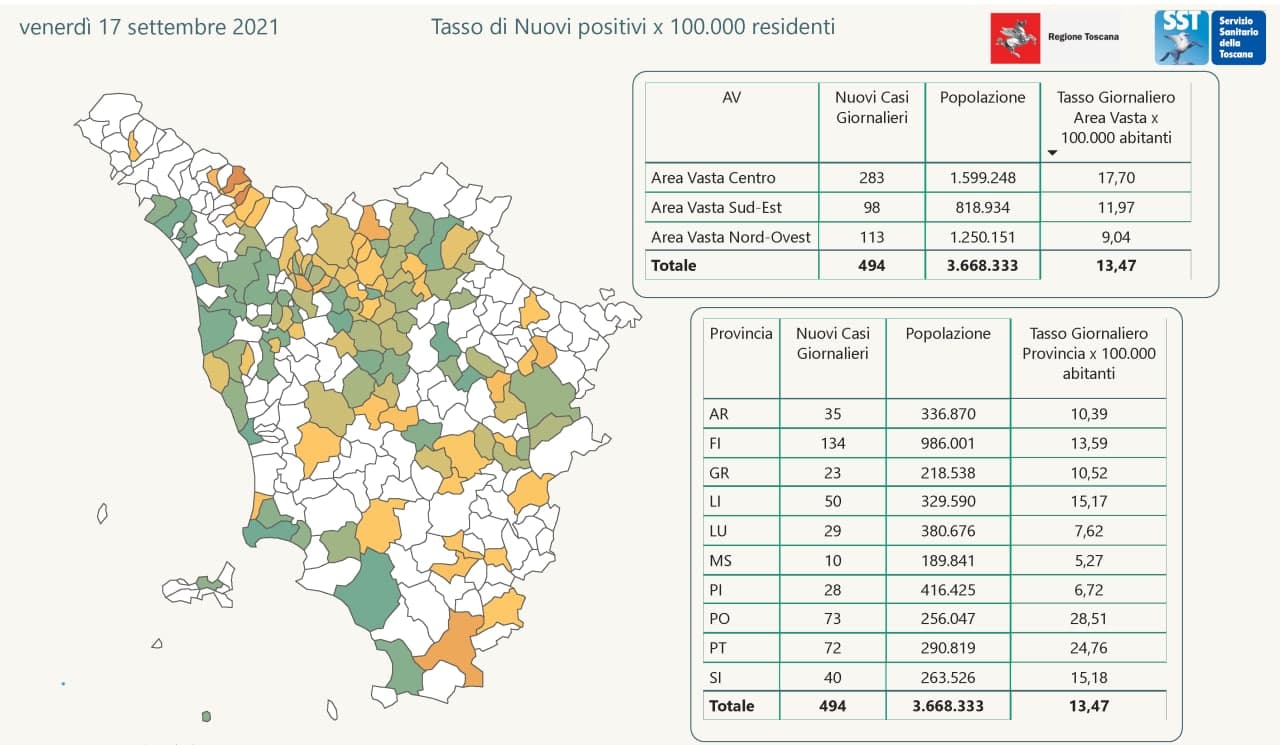 Anticipati i dati di oggi 17 settembre in Regione Toscana dal governatore Giani. Sono 494 i nuovi casi positivi in Toscana nelle ultime 24 ore