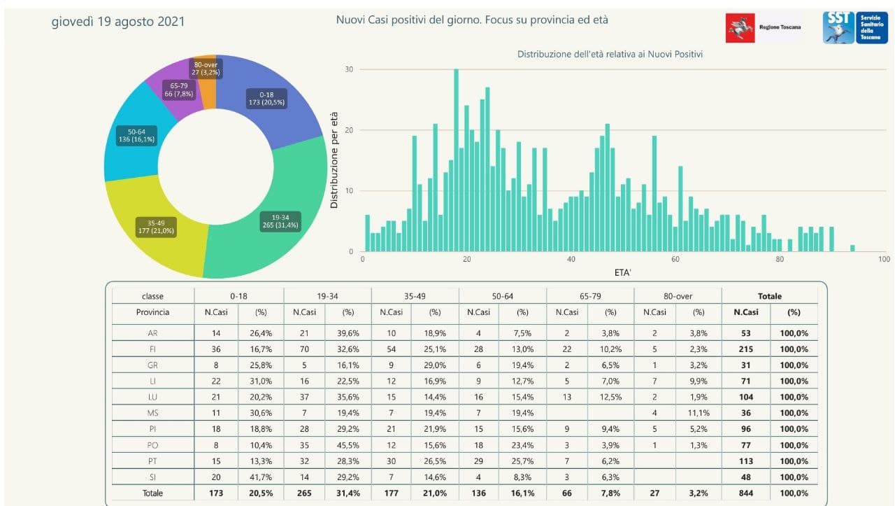 Anticipati i dati di oggi 19 agosto in Regione Toscana dal governatore Giani. Sono 844 i nuovi casi positivi in Toscana nelle ultime 24 ore