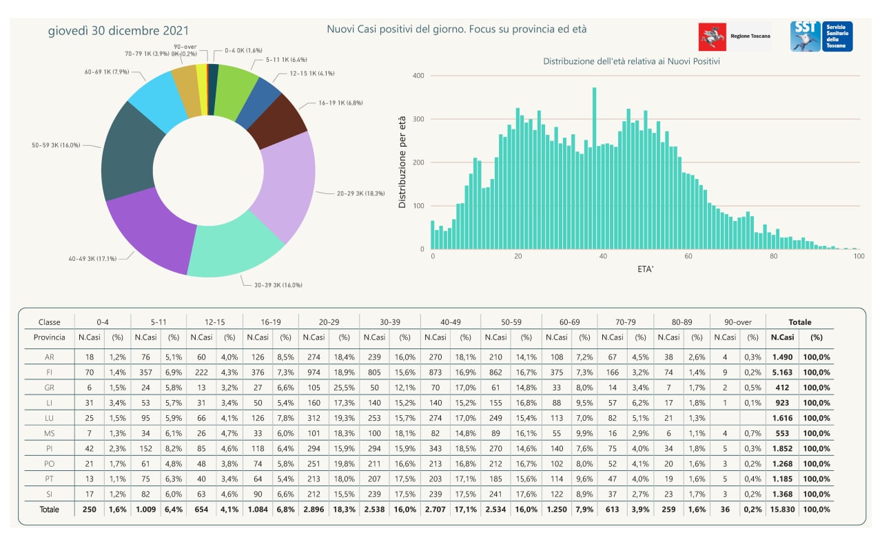 “I nuovi casi registrati in Toscana sono 15.830 su 69.759 test di cui 25.126 tamponi molecolari e 44.633 test rapidi. Il tasso dei nuovi positivi è 22,69% (69,6% sulle prime diagnosi).
